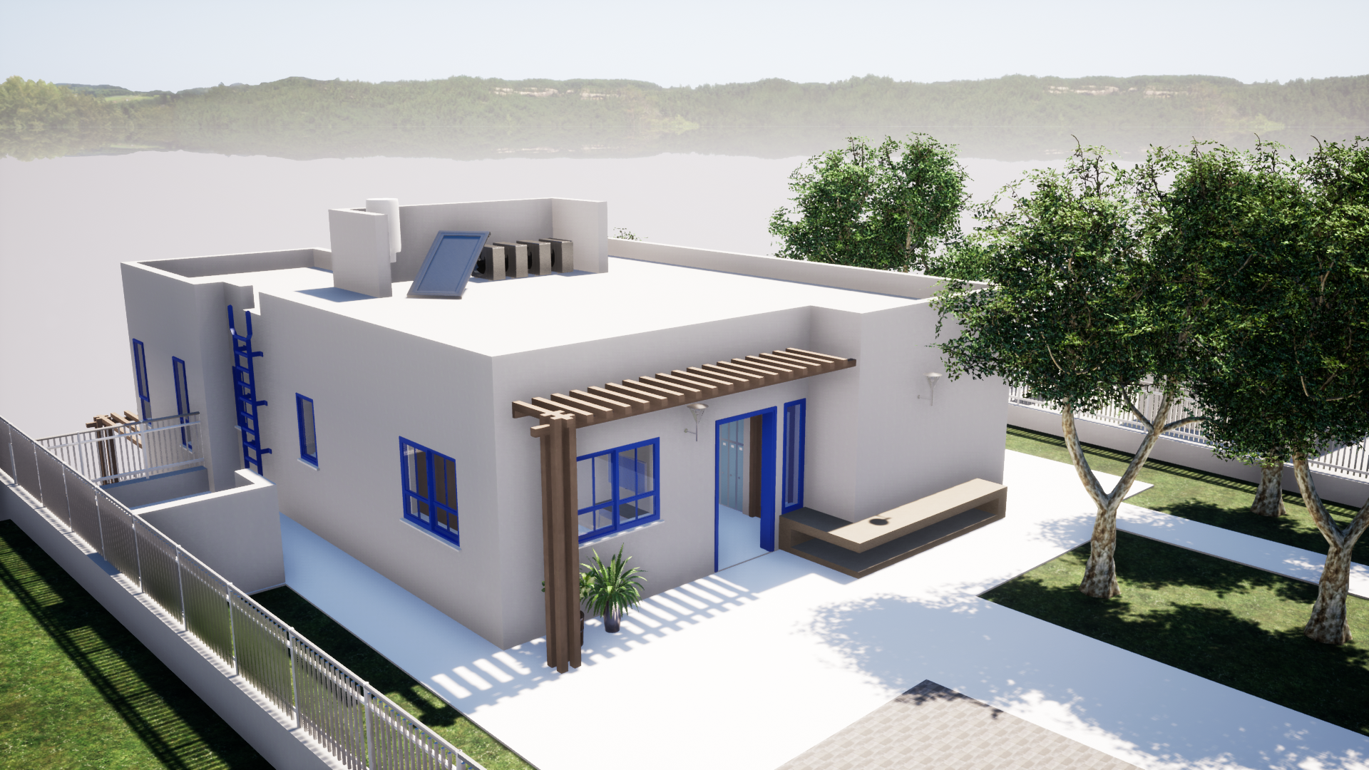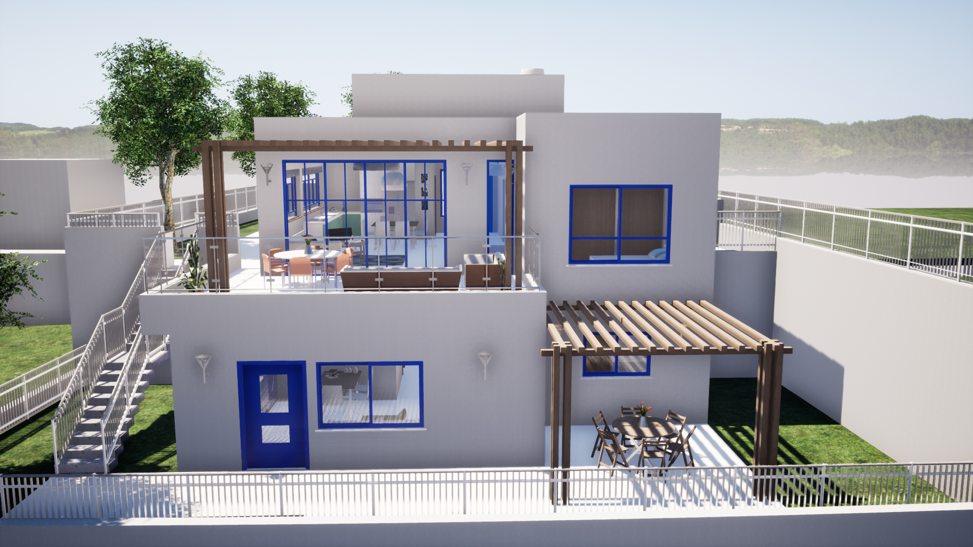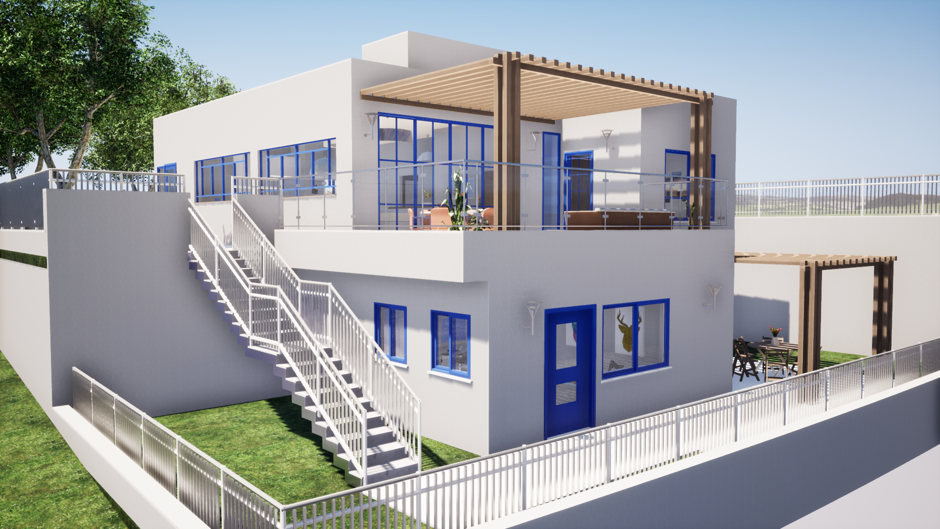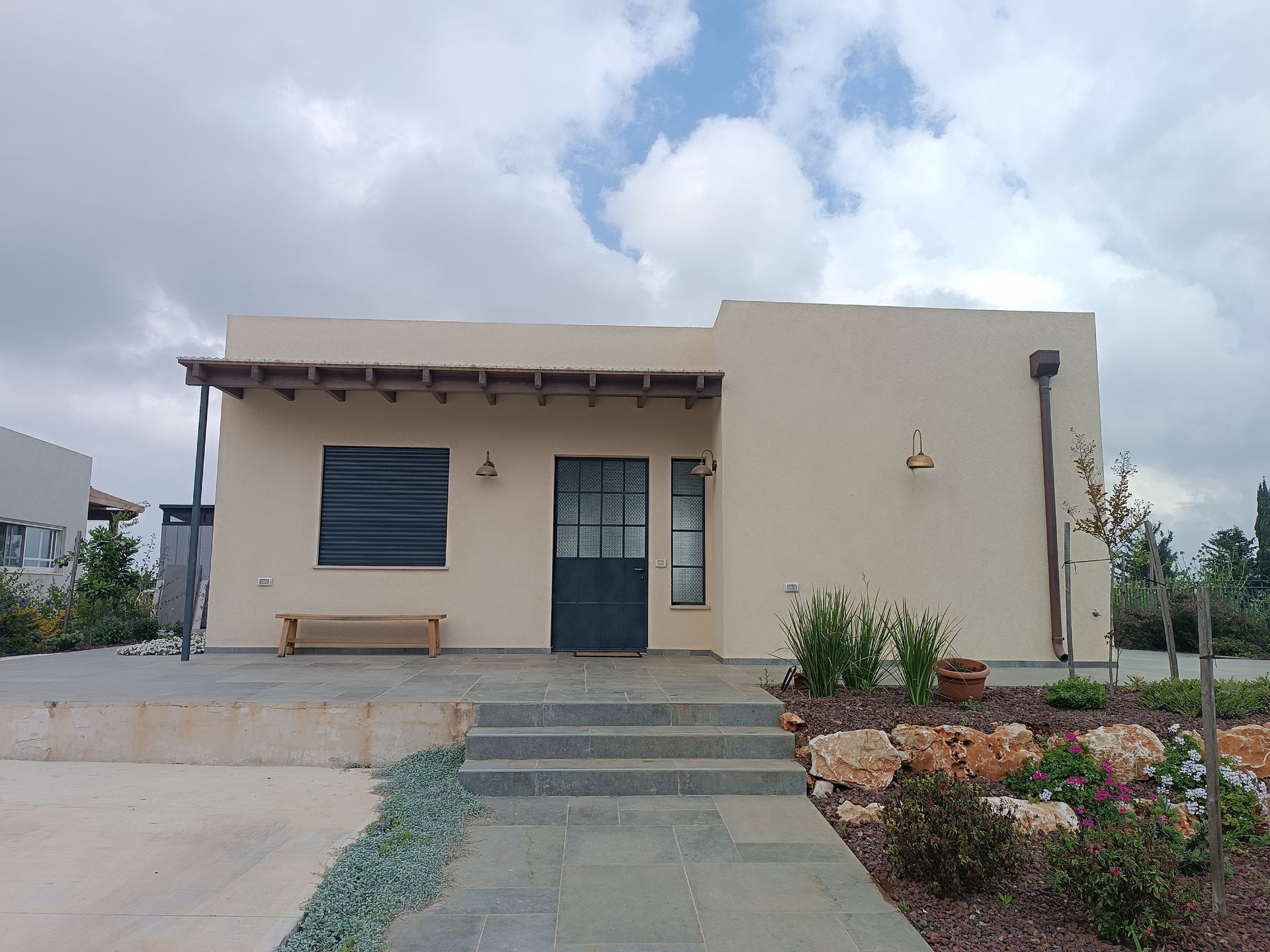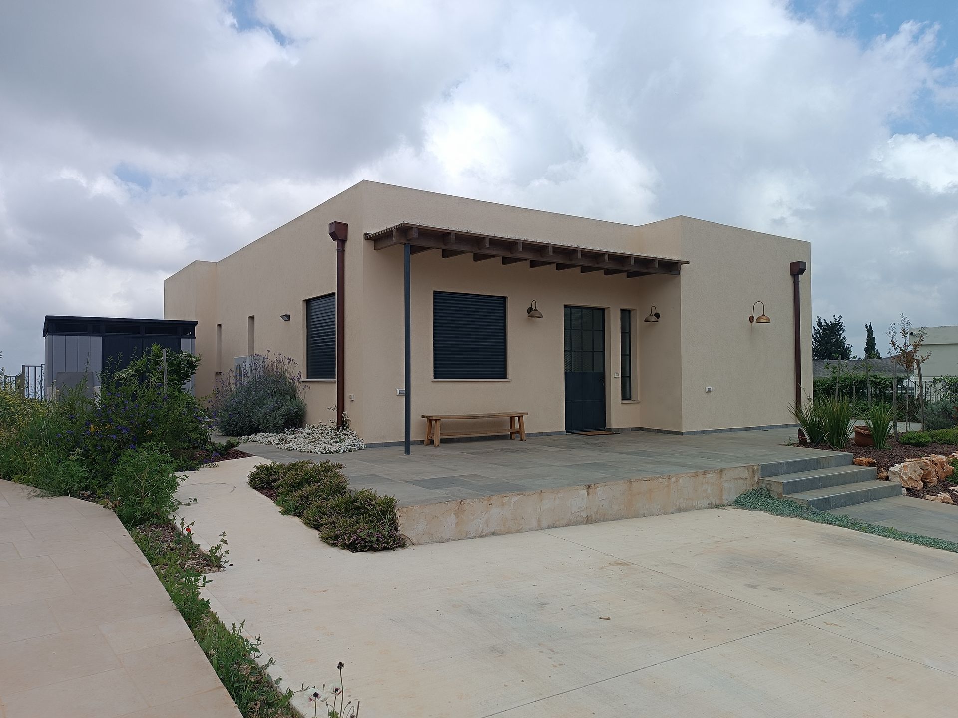 על מגרש מדורג רצינו לייצר בית שיראה צנוע ופשוט מכיוון הרחוב ובחלק בעוד שהמסה הגדולה של הבית "תסתתר" בחלקו האחורי-התחתון.